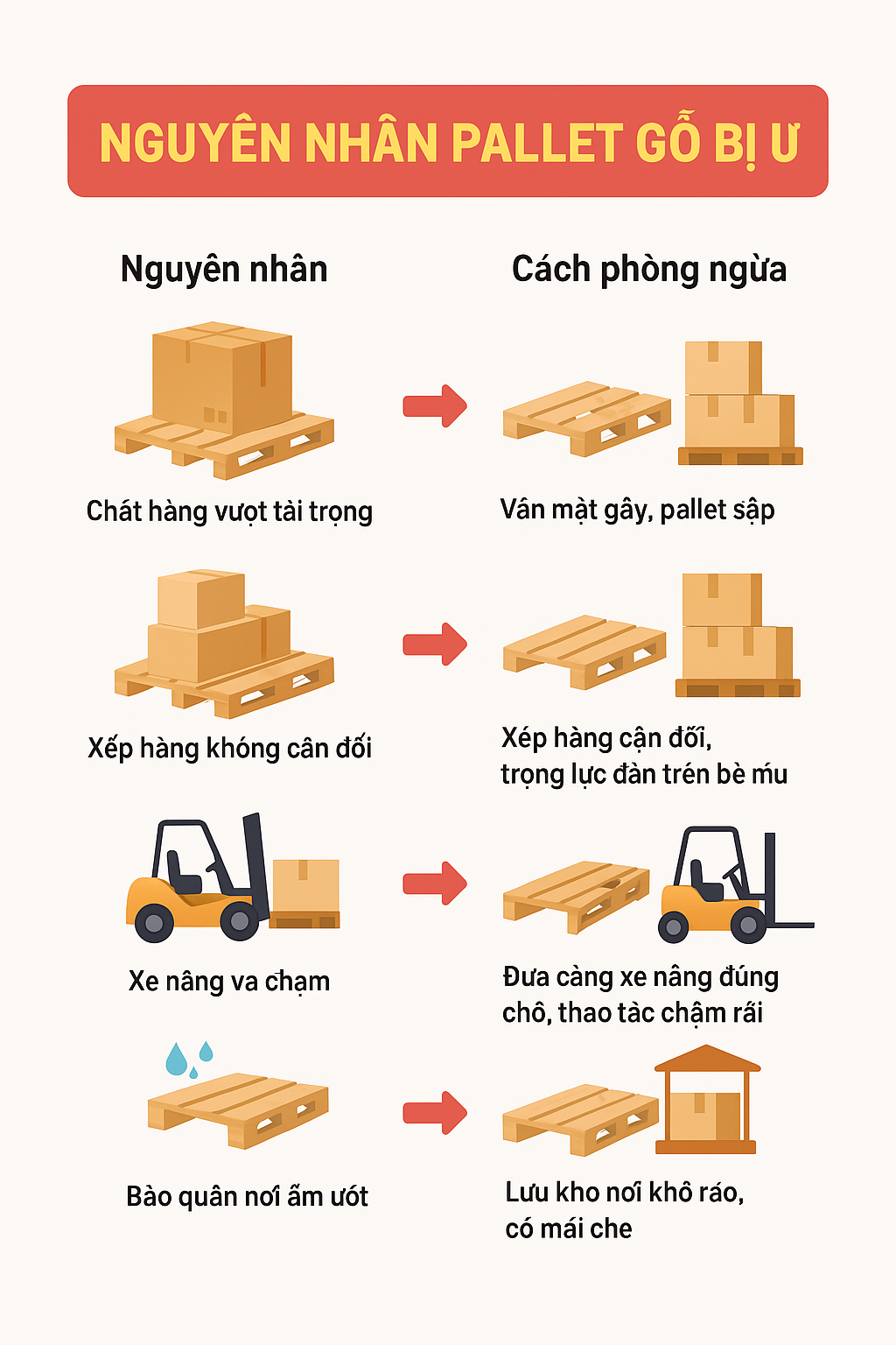 | Mối mọt, côn trùng phá hoại | Pallet ruỗng, mất khả năng chịu lực | Phun thuốc chống mối, kiểm tra định kỳ |