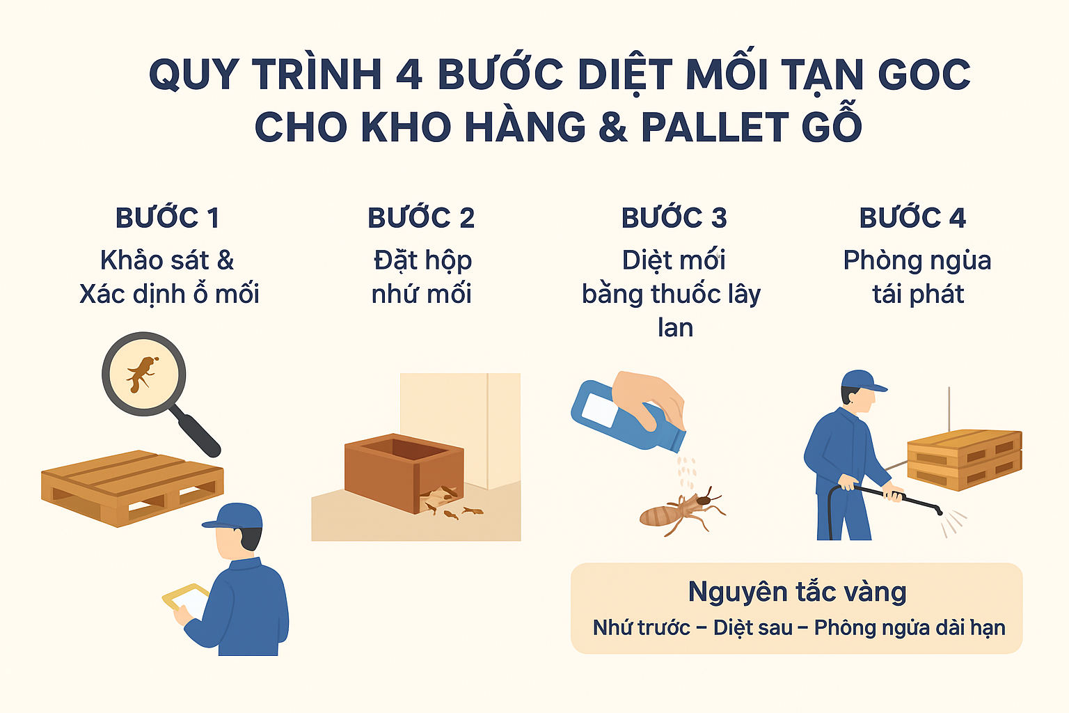 QUY TRÌNH 4 BƯỚC DIỆT MỐI TẬN GỐC CHO KHO HÀNG & PALLET GỖ