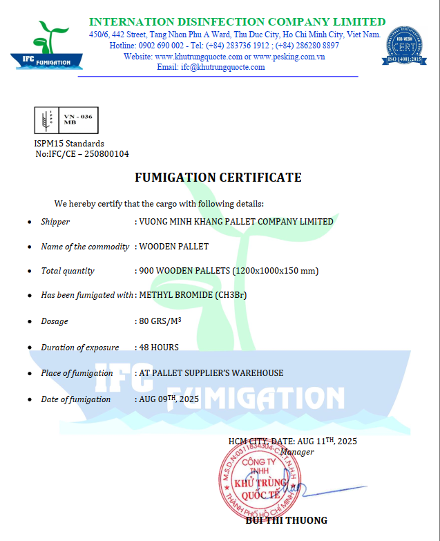 Chúng tôi cung cấp giấy chứng nhận khử trùng hoàn chỉnh, hợp lệ theo quy định của IPPC, phù hợp để xuất khẩu sang các thị trường yêu cầu tiêu chuẩn ISPM 15. Giấy chứng nhận này thể hiện rõ loại gỗ, nguồn gốc, quy trình xử lý, thời gian, giúp khách hàng dễ dàng lập hồ sơ hải quan, tạo điều kiện thuận lợi cho quá trình thông quan.
